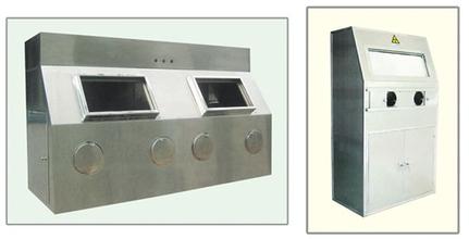 1、放射性同位素源分裝裝置,由箱體、機(jī)械手、抓取放射源瓶及開瓶蓋機(jī)構(gòu)、放射性同位素源分裝機(jī)構(gòu),照明及排氣機(jī)構(gòu)組成,其特征在于:a、機(jī)械手由弧形鉗口、彈簧、拉線、控制桿組成,在箱體的內(nèi)壁上固定有一層不銹鋼薄板,在箱體后壁正中偏上處設(shè)有機(jī)械千,機(jī)械手通過球體與箱體相連接,機(jī)械手前端安裝有兩個(gè)弧形鉗口,鉗口根部安裝有彈簧,鉗口的根部與拉線相連,拉線的另一端與控制桿相連;b、抓取放射源瓶及開瓶蓋機(jī)構(gòu)由吊架、齒輪、齒條、軸、操作手輪、卡頭組成,吊架上裝有齒輪與齒條,齒輪與齒條嚙合,齒輪裝在軸上,軸兩端裝有扭簧,并通過聯(lián)接軸與箱體外面的操作手輪相連,軸與裝扭簧的固定盒都固定在吊架上,齒條內(nèi)孔固定有電機(jī),減速器通過聯(lián)軸節(jié)、軸承與輸出軸連接,壓蓋將齒條下端密封,卡頭通過螺釘與輸出軸活動(dòng)連接,吊架由螺栓固定在箱體上;c:放射性同位素源分裝機(jī)構(gòu)由分裝罐,球形閥門、計(jì)量指示器、觀察鏡、釋放器組成,分裝罐由內(nèi)外兩層不銹鋼筒做成,夾層由鉛充實(shí),分裝罐的下端裝有球形閥門,并引出箱體的外面與手柄相連,分裝罐內(nèi)設(shè)浮子,通過引線引出箱體外經(jīng)兩滑輪與計(jì)量指示器相連,計(jì)量指示器的下端連接有重錘,箱體的右側(cè)設(shè)有裝源觀察鏡,觀察鏡內(nèi)設(shè)互成45度角的兩片鏡片,在觀察鏡上片的背后固定有屏蔽鉛板,箱體右側(cè)下部設(shè)有釋放器及固定裝置,井通過球體固定在箱休上。